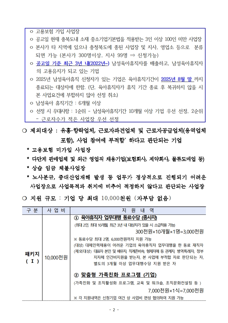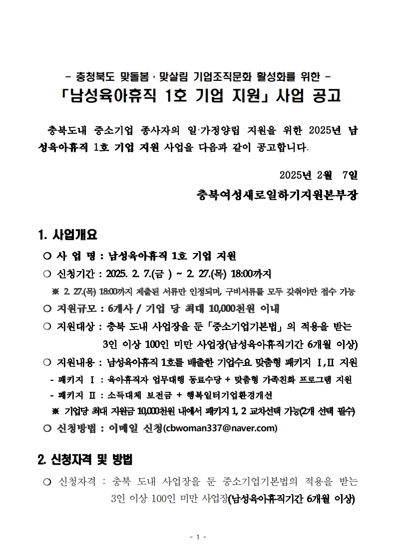 | 제목 | [모집공고] 2025년 『남성육아휴직 1호』 기업 모집 공고 | ||