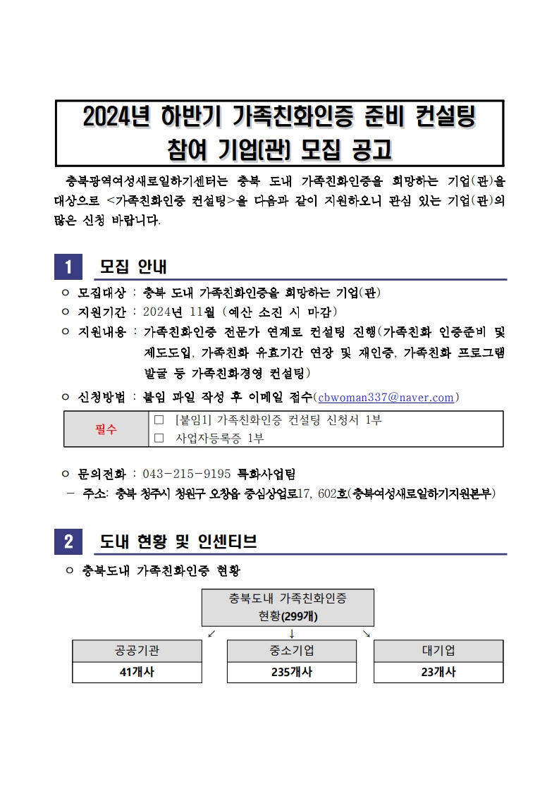 | 제목 | 2024년 하반기 가족친화인증 준비 컨설팅 공고 | ||