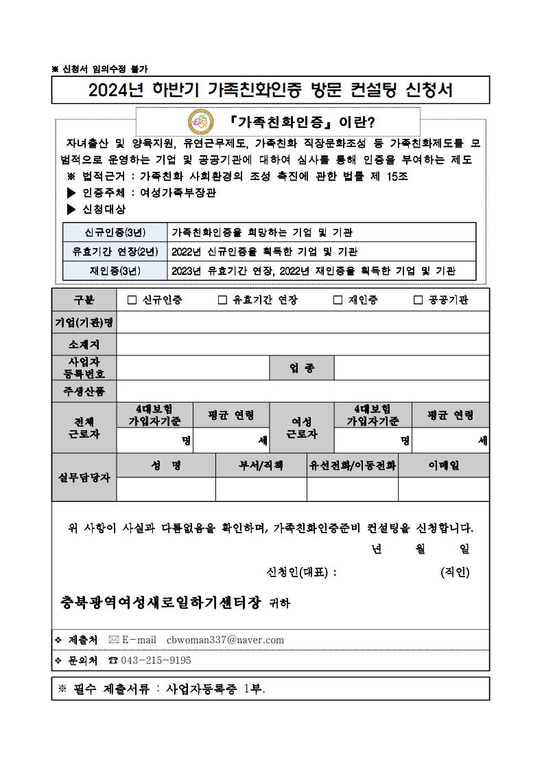| 첨부 | 붙임 1. 2024년 하반기 가족친화인증 준비 컨설팅 공고 및 신청서.hwp (253,456 KB, Download : 76) |
